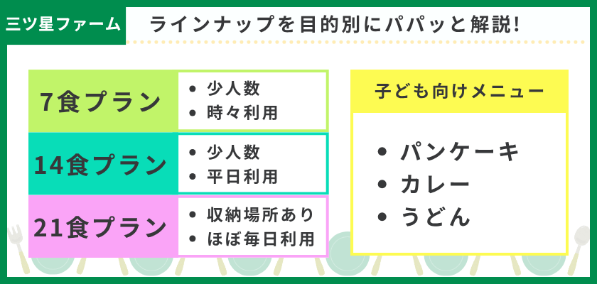 ▼三ツ星ファーム冷凍弁当の目的別ラインナップをパパッと解説!